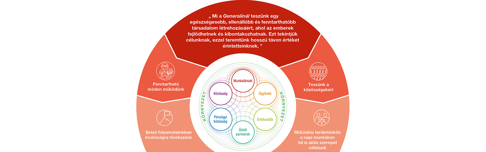 Célunk, hogy megértsük és alkalmazkodjunk a jelen igényeihez anélkül, hogy korlátozzuk a jövő generáció lehetőségeit. Víziónk, hogy elősegítsük a fenntartható fejlődést, növeljük a bizalmat a Generali iránt, és piacainkon a fenntarthatóság élvonalában legyünk.