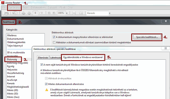 Adobe Acrobat Readerben: „Menü”-re kattintva > „Beállítások” menüpont > „Aláírások” menüpont > „Ellenőrzés” blokk „Tovább” gomb > „Együttműködés a Windows rendszerrel” blokkban mindkét beállítást be kell pipálni („Aláírások érvényesítése” és „Hiteles dokumentumok ellenőrzése”).