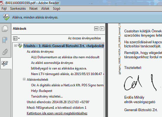 A Generali Biztosító Zrt. elektronikus aláírását Magyarország első minősített hitelesítés- és időbélyegzés-szolgáltatója, a NetLock Kft. hitelesíti.